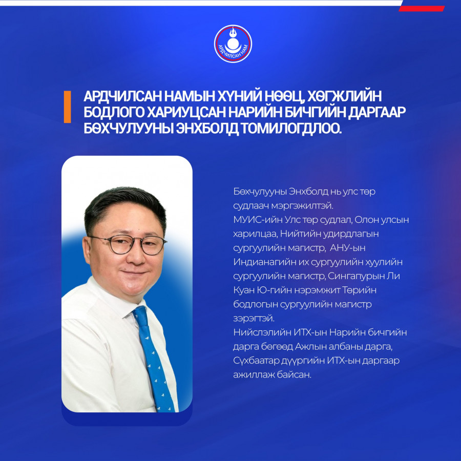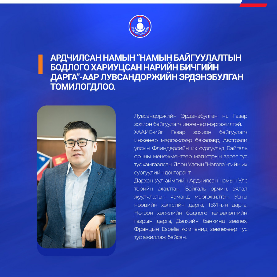 АН-ын "Намын байгуулалтын бодлого хариуцсан нарийн бичгийн дарга"-аар Лувсандоржийн Эрдэнэбулганыг томиллоо. Тэрбээр: