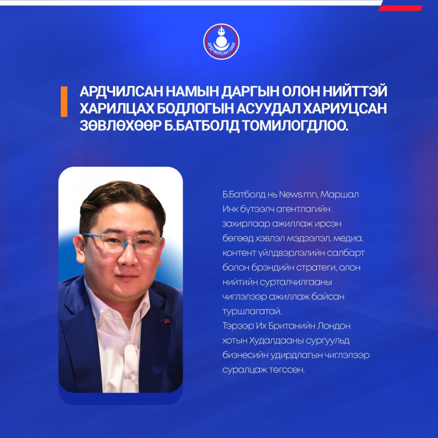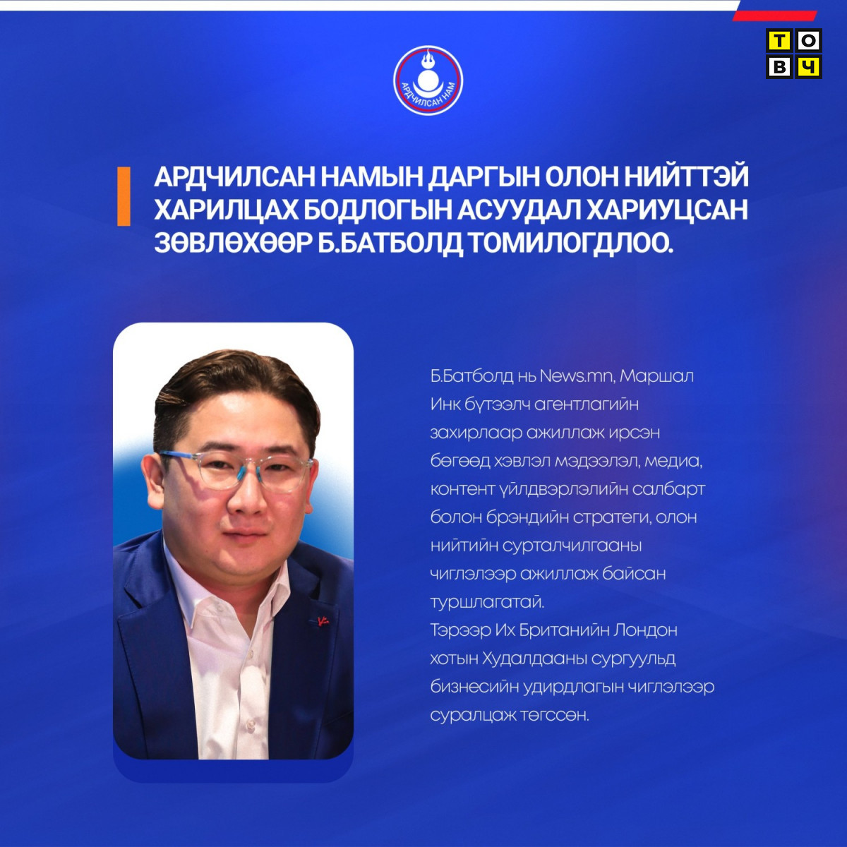 АН-ын даргын Олон нийттэй харилцах бодлогын асуудал хариуцсан зөвлөхөөр Б.Батболдыг томилсон байна. Тэрбээр: