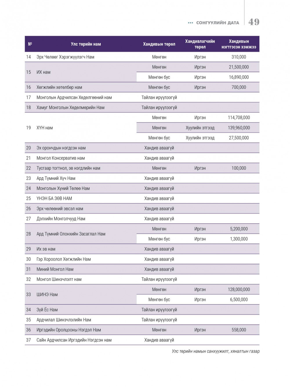 Иргэний Зориг Ногоон Нам 66 сая төгрөг тус тус тайлагнажээ.