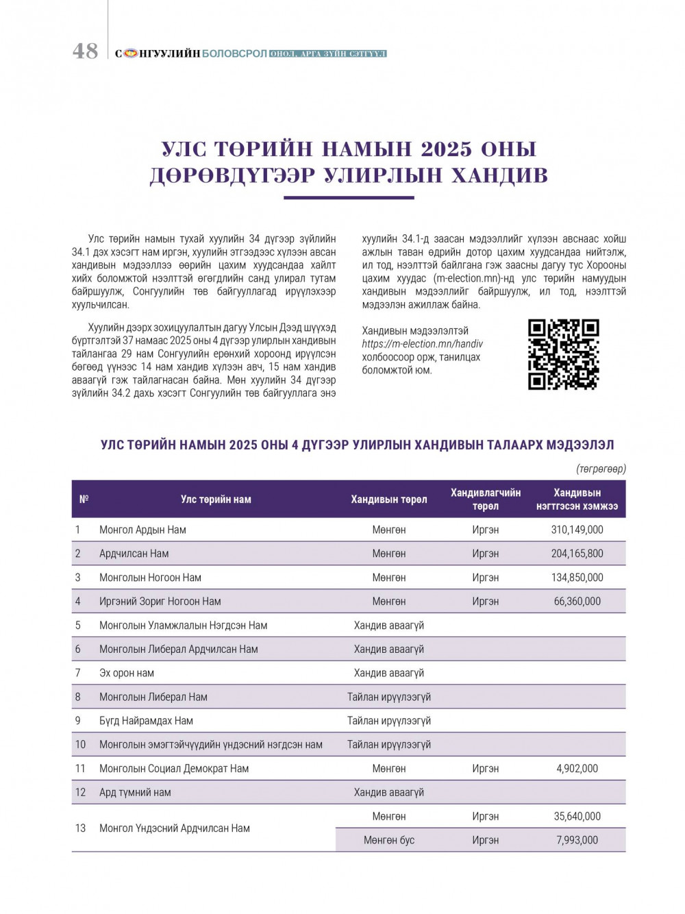 Улс төрийн намын тухай хуулийн 34.1-т зааснаар нам иргэн, хуулийн этгээдээс хүлээн авсан хандивын мэдээллээ улирал тутам нээлттэй өгөгдлийн санд байршуулж, Сонгуулийн ерөнхий хороонд хүргүүлэх үүрэгтэй. Энэ зохицуулалтын хүрээнд 2025 оны IV улирлын тайланг 37 намаас 29 нь хүргүүлж, 14 нам хандив хүлээн авсан байна.