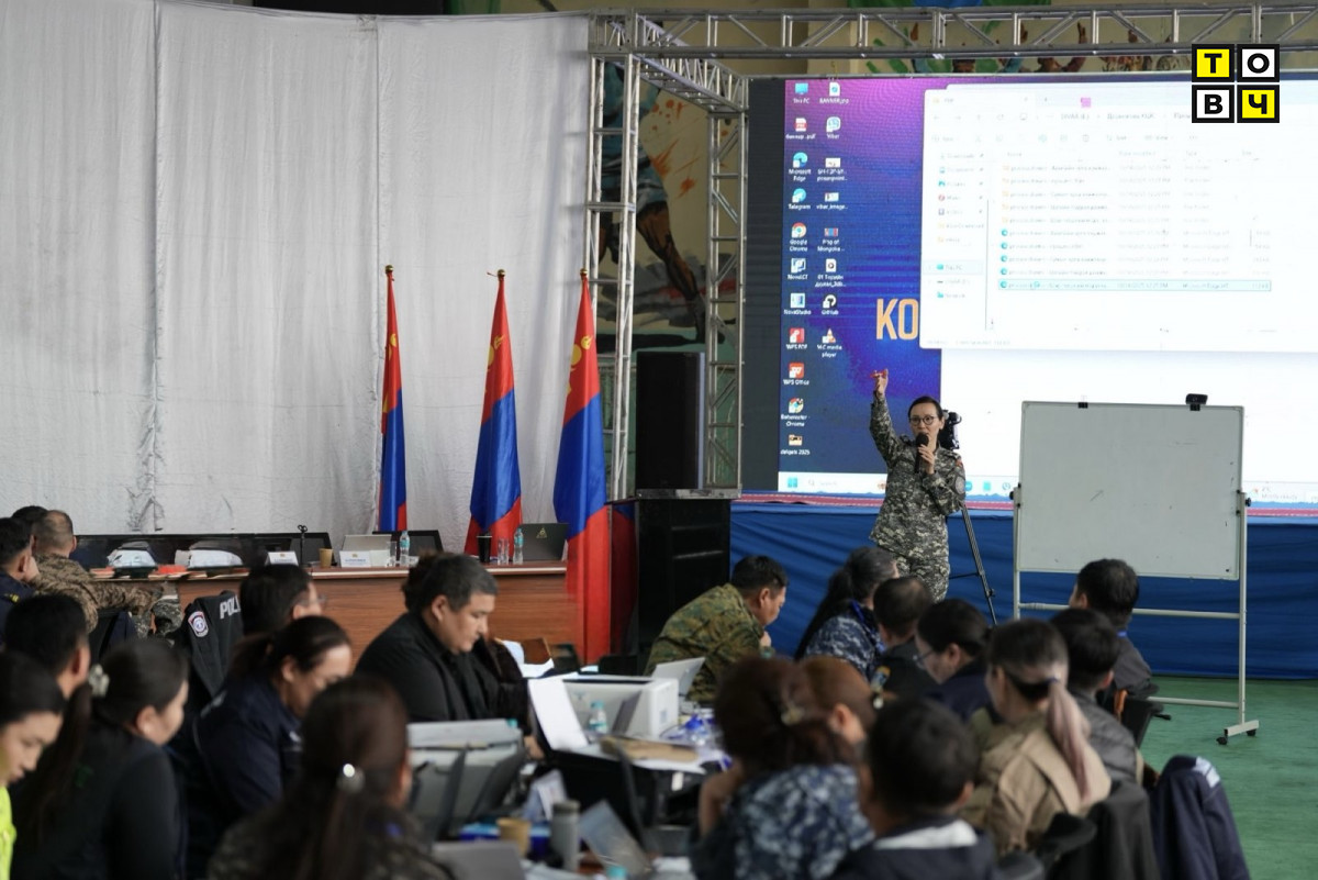 Оролцогчид сургуулийн бодлогын дагуу алба, мэргэжлийн ангиудын харилцан ажиллагааг уялдуулах, болзошгүй гамшгийн үед хэрэгжүүлэх хариу арга хэмжээний шуурхай байдлыг дээшлүүлэх зорилгоор өгөдсөн хийсвэр цагийн байдлын дагуу штабын дадлага хийж байна.