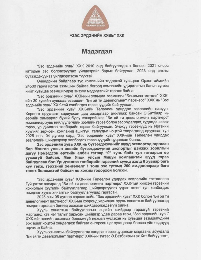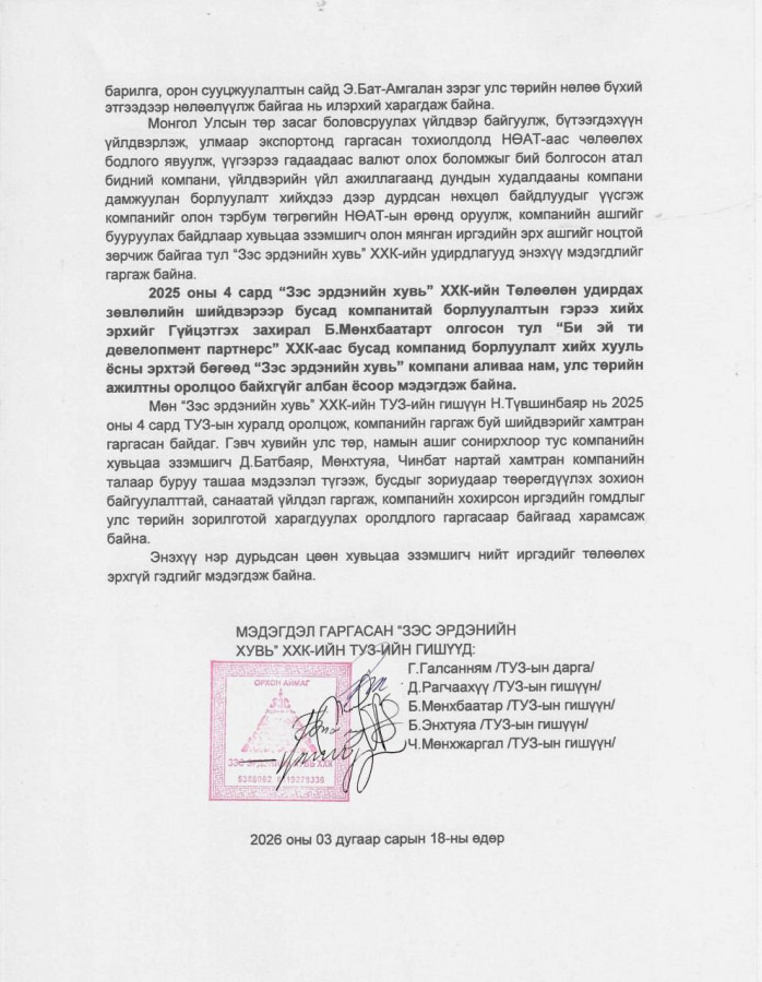 Орхон аймгийн 24,500 гаруй иргэн хувьцаа эзэмшдэг "Зэс эрдэнийн хувь" ХХК-ийн Төлөөлөн удирдах зөвлөлийн гишүүд 2026 оны 3 дугаар сарын 18-нд олон нийтэд хандан мэдэгдэл гаргалаа. Тус мэдэгдэлд Гүйцэтгэх захирал хувьцаа эзэмшигчдийн эрх ашгийг ноцтой зөрчсөн талаар дурдсан байна.