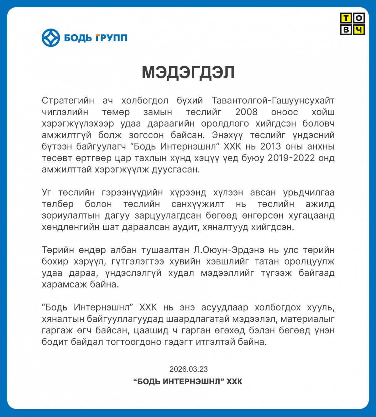 Бодь Интернэшнл ХХК мэдэгдэл гаргажээ.