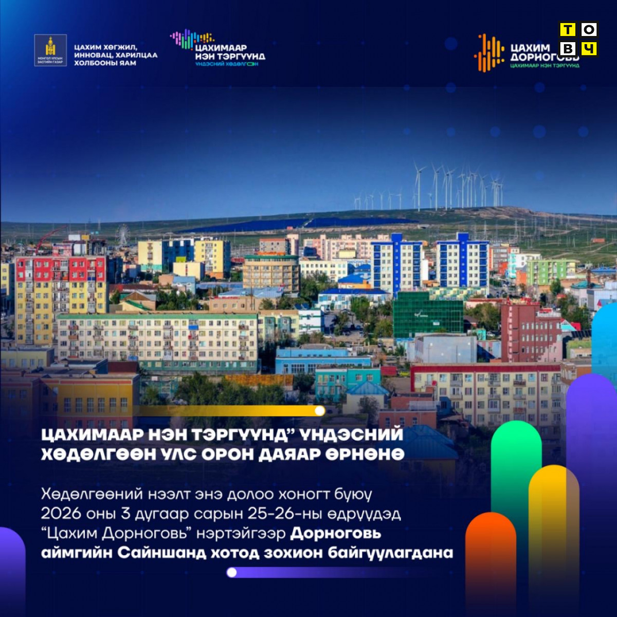 Иргэдийн цахим ур чадварыг дээшлүүлж, төрийн цахим үйлчилгээний хүртээмжийг нэмэгдүүлэх зорилготой “Цахимаар нэн тэргүүнд” үндэсний хөдөлгөөнийг Монгол Улсын Засгийн газрын 2025 оны 108 дугаар тогтоолоор хэрэгжүүлж эхэллээ. Тус хөдөлгөөний нээлтийн хүрээнд Цахим хөгжил, инновац, харилцаа холбооны яам 2026 оны 3 дугаар сарын 25-26-ны өдрүүдэд Дорноговь аймгийн Сайншанд хотод “Цахим Дорноговь” өдөрлөгийг зохион байгуулна.