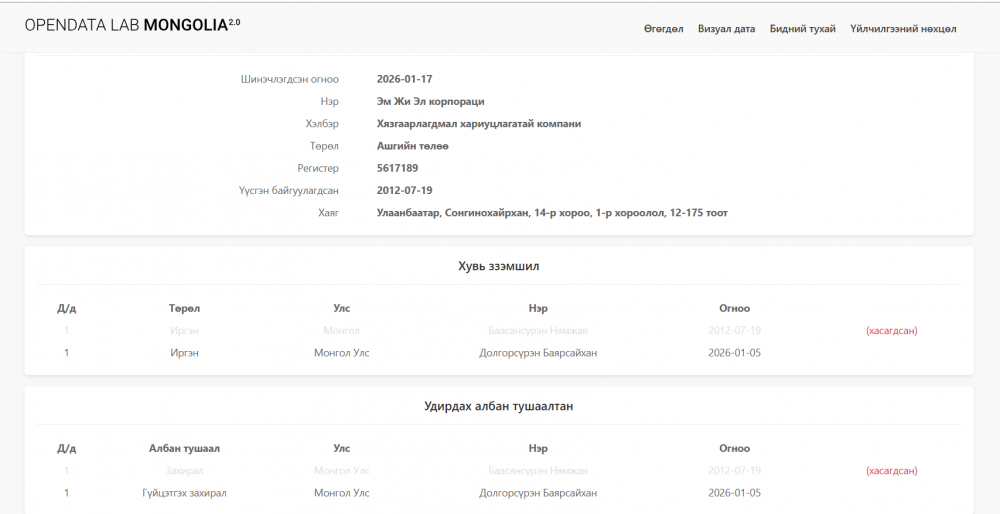 "Эм Жи Эл Корпораци" ХХК нь Төсөл хөтөлбөр боловсруулах чиглэлээр үйл ажиллагаа явуулдаг бөгөөд Баасансүрэн Нямжав, Долгорсүрэн Баярсайхан нар хамтран эзэмшдэг байжээ. Харин энэ сарын 1 дүгээр сард тус компанийн удирдлагад өөрчлөлт орж, Баасансүрэн Нямжав нь хувь эзэмшлээсээ татгалзсанаар эцсийн өмчлөгч нь Долгорсүрэн Баярсайхан болсон байна.