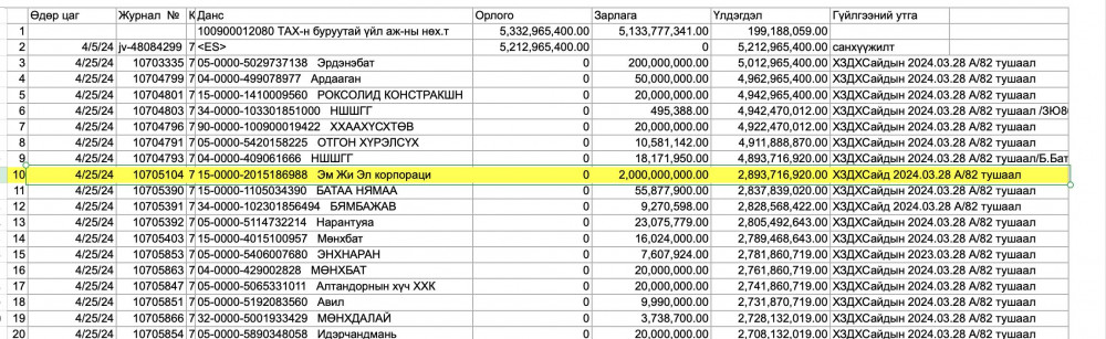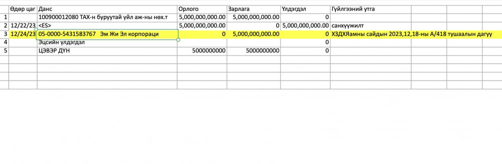 2023 оны 12 сарын 18 өдрийн ХЗДХ сайд Б.Энхбаярын А/418 тоот тушаалын дагуу 2023 оны 12 сарын 24 өдөр "Эм Жи Эл Корпораци" ХХК-ийн дансруу шилжсэн ба уг мөнгөн эх үүсвэр дансруу орж ирэхээс 4 хоногийн өмнө сайдын тушаал гарсан нь урьдчлан бэлдсэн байгааг харж болно.
