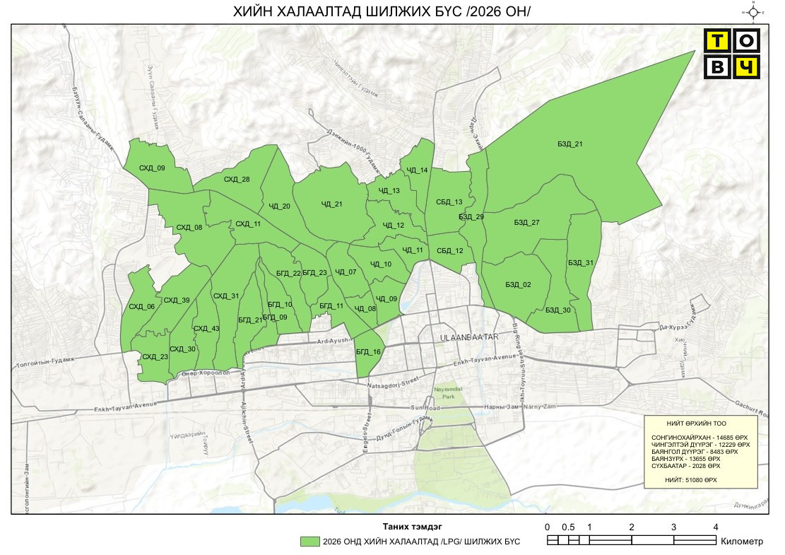 - Баянзүрх дүүргийн 2, 21, 27, 29, 30, 31 дүгээр хорооны 13655 өрх,