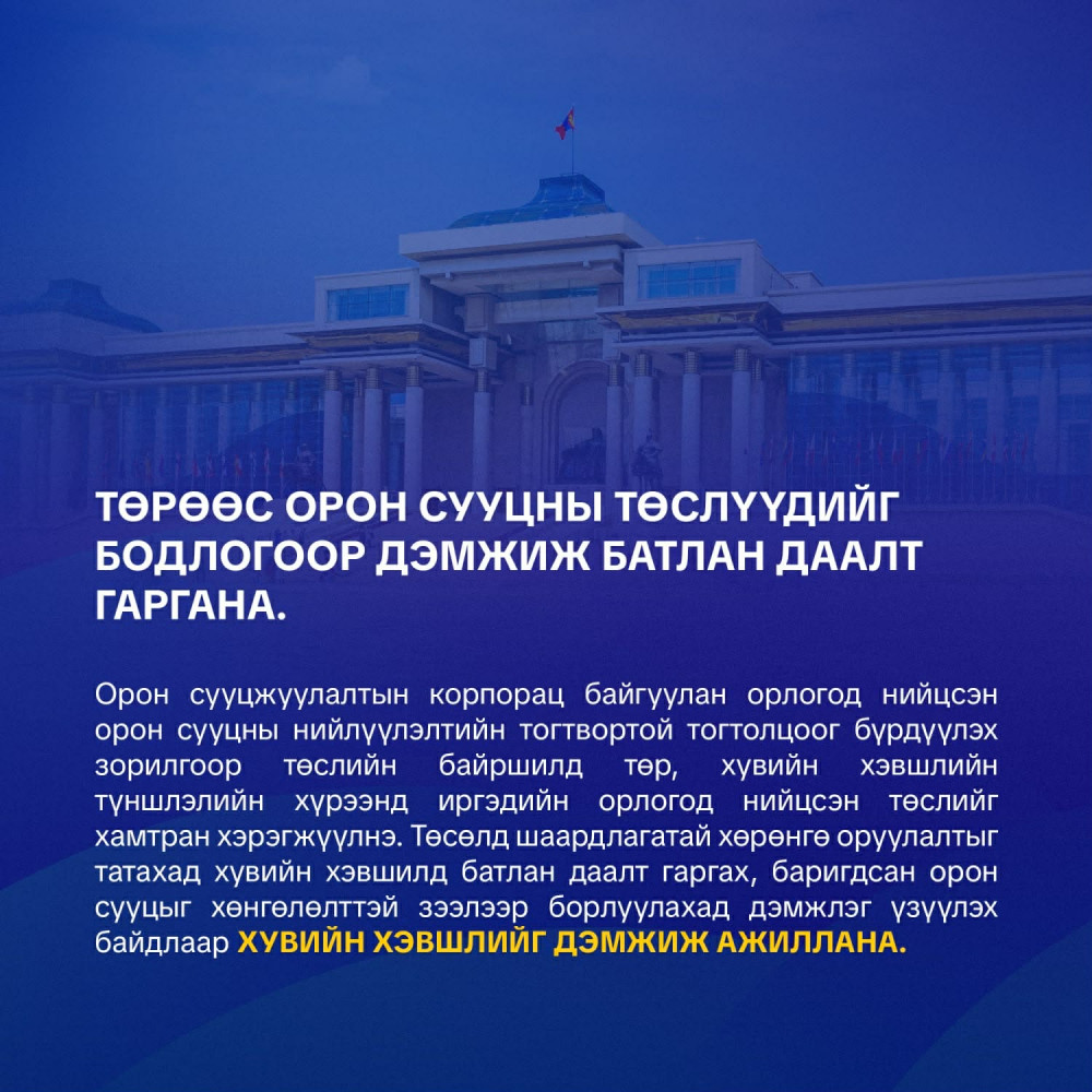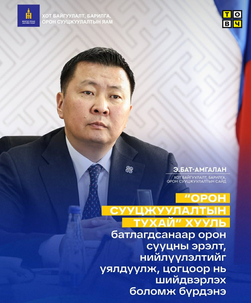 УИХ-ын хаврын ээлжит чуулганаар Барилгын тухай хууль, Хот байгуулалтын тухай хуулийн шинэчилсэн найруулгын төсөл, анхдагч хуулийн төсөл болох Орон сууцны санхүүжилтийн банкны тухай хууль, Орон сууцжуулалтын тухай хуулийн төслийг өргөн мэдүүлэхээр бэлтгэл ажлыг ханган ажиллаж байна.