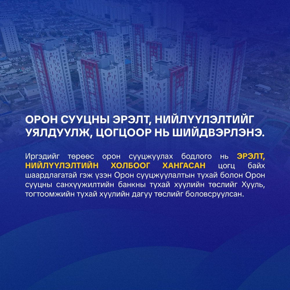 Уг хууль батлагдсанаар орон сууцны эрэлт, нийлүүлэлтийг уялдуулж, цогцоор нь шийдвэрлэх боломж бүрдэнэ.