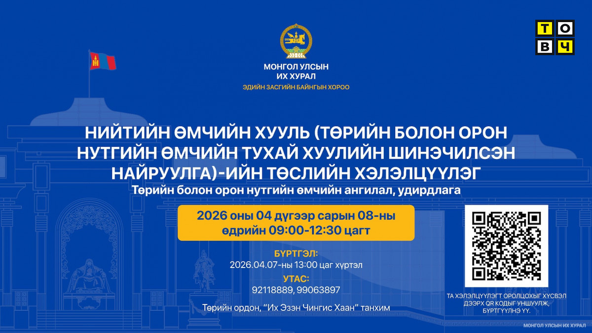 Улсын Их Хурлын Эдийн засгийн байнгын хороо, Монгол Улсын Их Хурлын даргын 2025 оны 529 дүгээр захирамжаар байгуулагдсан ажлын хэсгээс Нийтийн өмчийн хууль (Төрийн болон Орон нутгийн өмчийн тухай хуулийн шинэчилсэн найруулга)-ийн төслийн хэлэлцүүлгийг “Төрийн болон орон нутгийн өмчийн ангилал, удирдлага” сэдвээр 2026 оны 04 дүгээр сарын 08-ны Лхагва гарагт, 09.00 цагт явуулна. Хэлэлцүүлэгт оролцогчдыг онлайнаар нээлттэй бүртгэж байна.