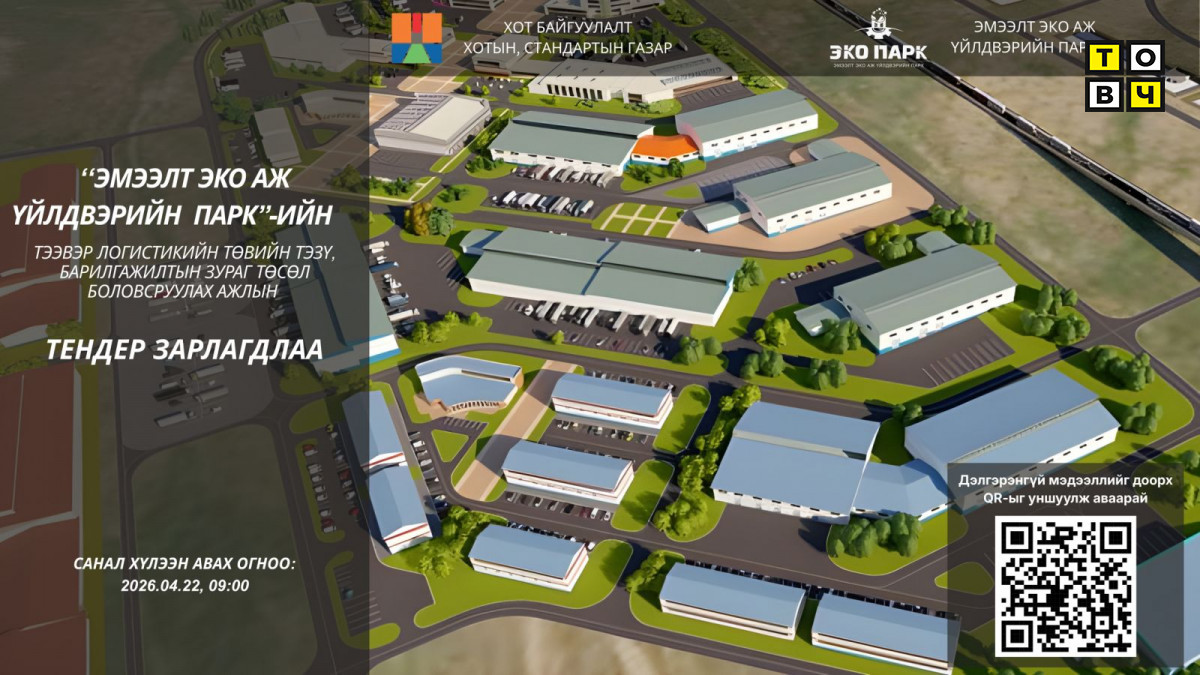 Мах, арьс шир, ноос ноолуур зэрэг малын гаралтай түүхий эдийг бүрэн боловсруулж, нэмүү өртөг шингэсэн бүтээгдэхүүн үйлдвэрлэлийг бий болгох зорилготой "Эмээлт эко аж үйлдвэрийн парк"-ийн Тээвэр, логистикийн төвийн ТЭЗҮ, барилгажилтын зураг төсөл боловсруулах ажлын тендер зарлагдлаа.