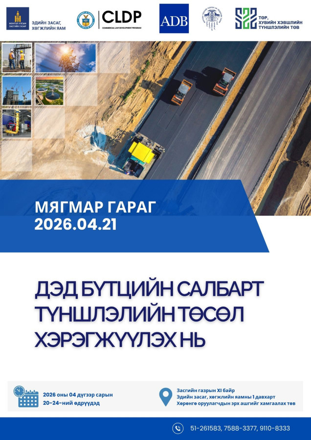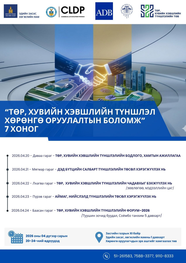 Монгол Улсын Засгийн газраас төр, хувийн хэвшлийн хамтын ажиллагааг шинэ шатанд гаргах, хөрөнгө оруулалтын таатай орчныг бүрдүүлэх зорилгоор “Төр, хувийн хэвшлийн түншлэл – Хөрөнгө оруулалтын боломж” 7 хоногийн нэгдсэн арга хэмжээ болон "Төр, хувийн хэвшлийн түншлэл 2026" форумыг 2026 оны 4 дүгээр сарын 20-ноос 24-ний өдрүүдэд зохион байгуулах гэж байна.
