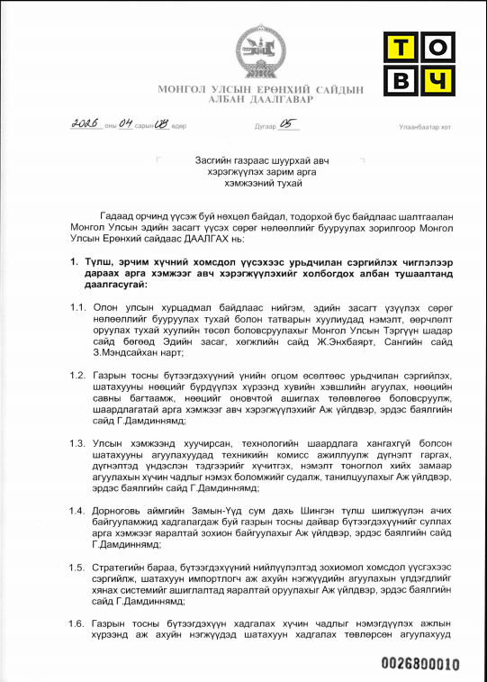 Тухайлбал энэхүү албан даалгаварын 5.4-т Хууль тогтоомжоор үүрэг болгосон эсвэл Засгийн газраас албан ёсны шийдвэр гарснаас бусад бүх төрлийн форум, хурал, баяр ёслол, тэмдэглэлт ой, урлагийн наадам, салбарын өдөр зэрэг олон нийтийн арга хэмжээг төсвийн хөрөнгөөр зохион байгуулахгүй байх, хурал, сургалт, семинар, зөвлөгөөнийг цахимаар зохион байгуулж, зардлыг бууруулахыг Сангийн сайд З.Мэндсайхан, Монгол Улсын сайд, Засгийн газрын Хэрэг эрхлэх газрын дарга Б.Энхбаяр, Төсвийн ерөнхийлөн захирагч нарт даалгасугай гэснийг үндэслэл болгожээ.