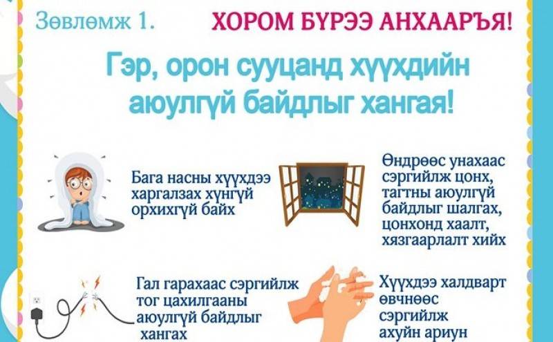 Засгийн газрын шийдвэрээр коронавирусээс урьдчилан сэргийлэх зорилгоор сургууль, цэцэрлэгийн үйл ажиллагааг 03 дугаар сарын 02-ныг хүртэл улс орон даяар зогсоосон. Энэхүү хорио цээрийн дэглэмтэй холбогдуулан хүүхдээ болзошгүй эрсдэлээс урьдчилан сэргийлэх зөвлөмжийг хүргэж байна.