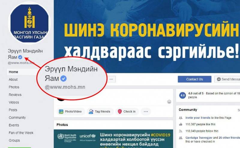 Хэн нэгний ах, эгч, найзын хэлсэнд бус АЛБАНЫ ЭХ СУРВАЛЖТАЙ мэдээлэлд итгэхийг манай сайтаас уриалж байна. Коронавирустэй холбоотой албан ёсны мэдээ, мэдээллийг та бүхэн “Эрүүл мэндийн яам“-ны фейсбүүк хуудаснаас авах боломжтой. Албан ёсны хуудас нь доорх зурагт харуулснаар нэрнийхээ ард “√” буюу зөв гэсэн цэнхэр тэмдэгтэй байгааг анхаараарай. Та энд дарж тус хуудсыг үзээрэй.