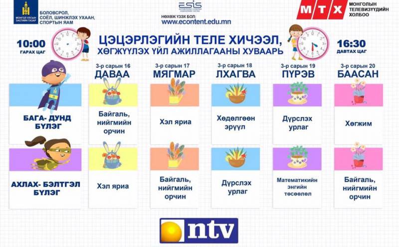 Ирэх долоо хоногийн буюу 2020.03.16-2020.03.20 ныг хүртэлх Теле хичээлийн хуваарийг хүргэж байна.