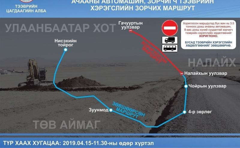 - Бүх жин нь 3.5 тн-оос дээш ачааны автомашин болон 8-аас дээш хүний суудалтай зорчигч тээврийн хэрэгслээс бусад тээврийн хэрэгслүүд Гачууртын уулзвараас-Налайх, Чойрын уулзвар хүртэлх чиглэлд гаргасан түр замаар зорчино.
