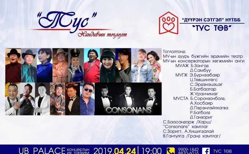 Дархан-Уул аймгийн “Дүүрэн сэтгэл” ТББ энэ сарын 25-ны өдрийн 19:00 цагаас “UB Palace”-т хандивын тоглолт хийхээр болжээ. Тоглолтонд Дуурь бүжгийн эрдмийн театр, Монгол Улсын консерваторийн хөгжмийн анги, Ардын жүжигчин Б.Зангад, Д.Самбуу, Гавьяат жүжигчин Э.Бүрнээбаяр, И.Түвшинтөгс, С.Эрдэнэцэцэг, Б.Батбаатар, Ж.Уранчимэг нарын алдартнуудаас гадна бусад дуучид, “Харш”, “Гранд” хамтлаг оролцож, сайхан сэтгэлт үзэгчдэдээ ая дуугаа өргөнө.