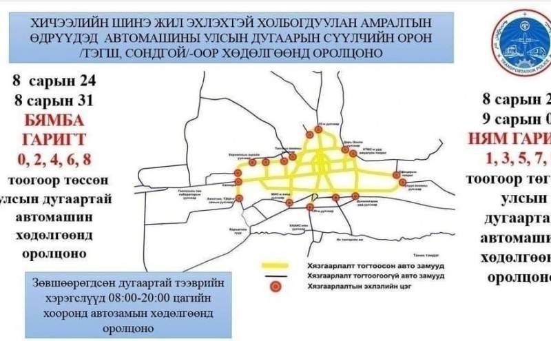 Тодруулбал, наймдугаар сарын 24, 25, 31, есдүгээр сарын 1-ний амралтын өдрүүдэд тээврийн хэрэгслийн улсын дугаарын сүүлийн оронг тэгш, сондгойгоор ангилан замын хөдөлгөөнд оролцуулах юм.